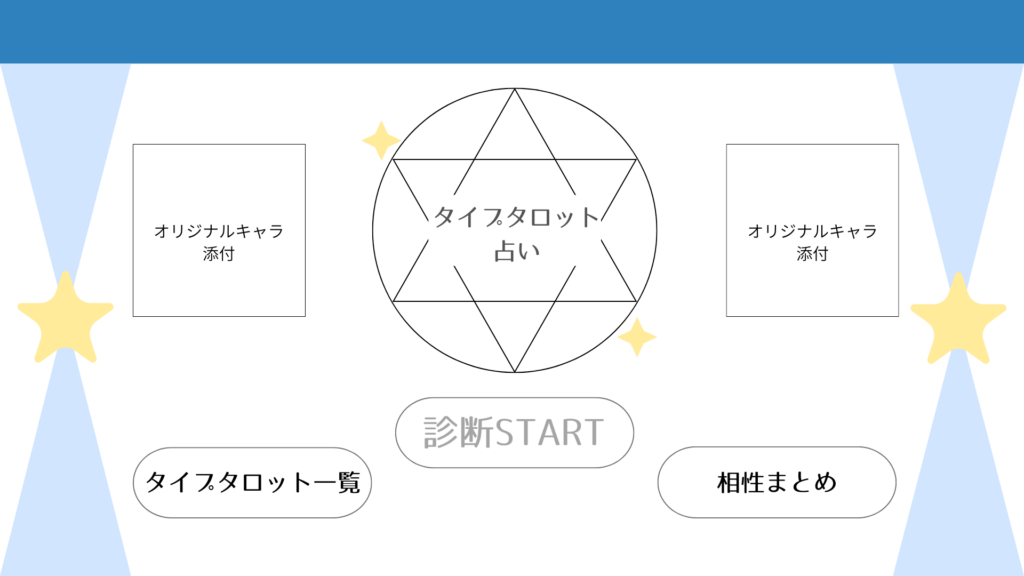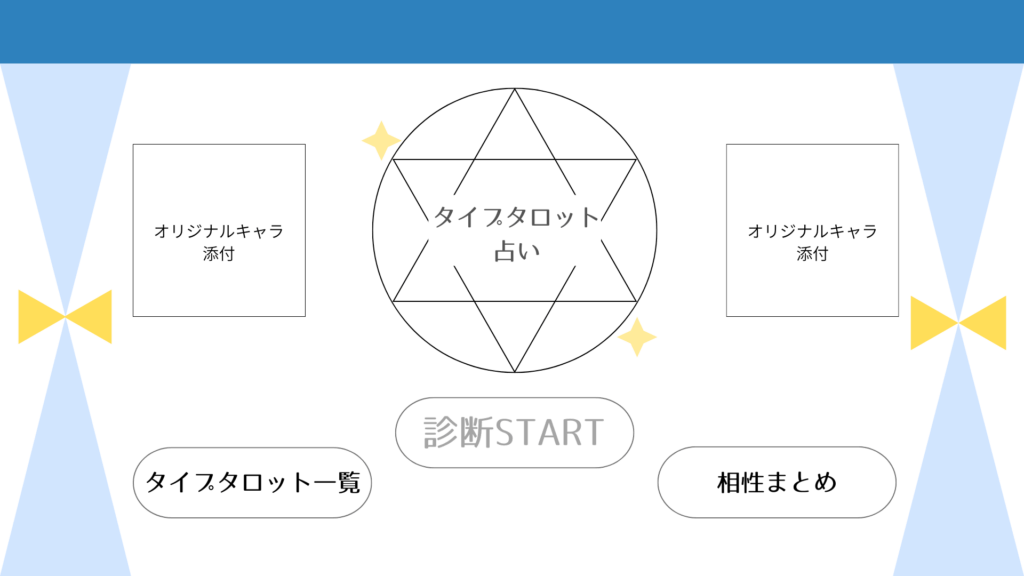 ノートにトップページの下書きをしてからcanvaで制作を行いました。オリジナルのキャラ添付には、自分で作ったタロットキャラを載せたいです。「タイプタロット一覧」と「相性まとめ」のボタンは、それぞれリンクページを作り、診断が終わった後他のタイプを見る事ができるようにしたり、相性を見れるように制作していきたいと思います。