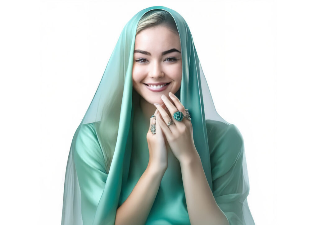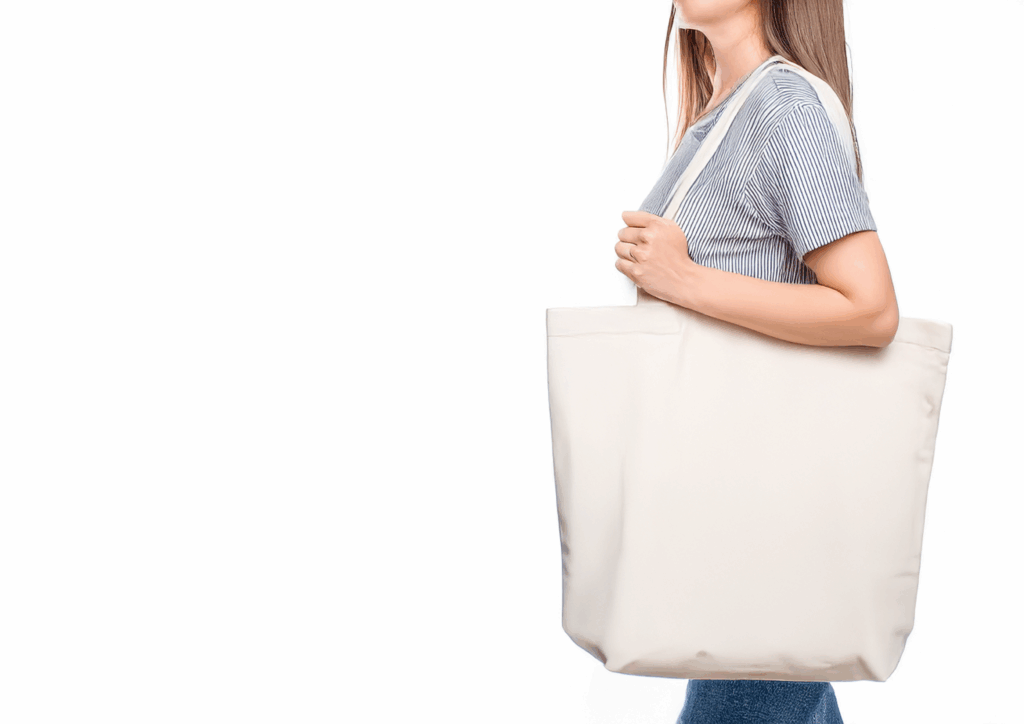 ①モックアップを作りたい。無地のトートバッグを持った白人の横向きの女性。顔は移っていない。