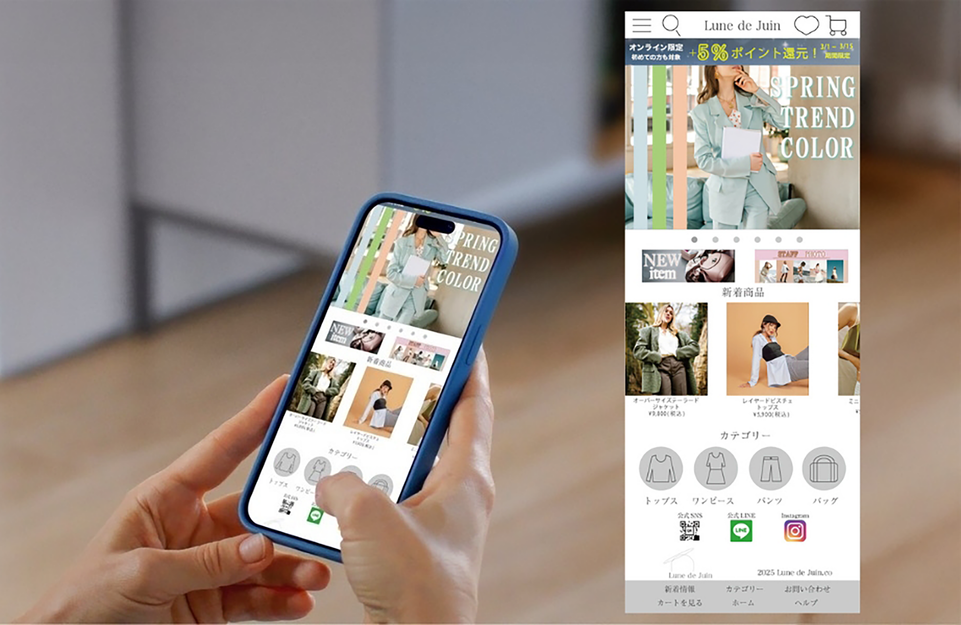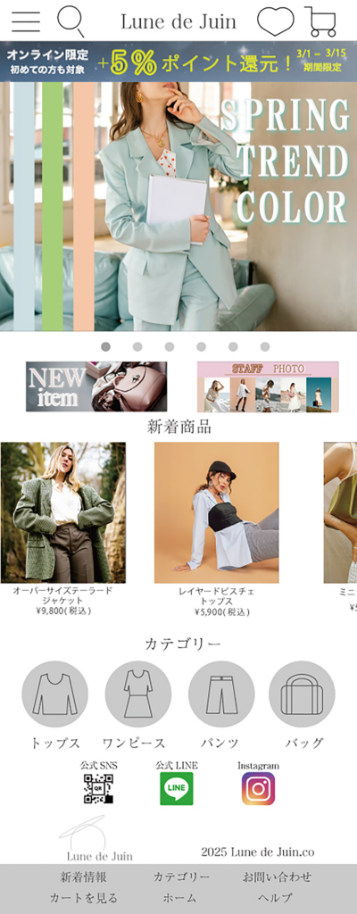 春のデイリー服をテーマに、スマホ向けECサイトのトップページデザインを制作しました。