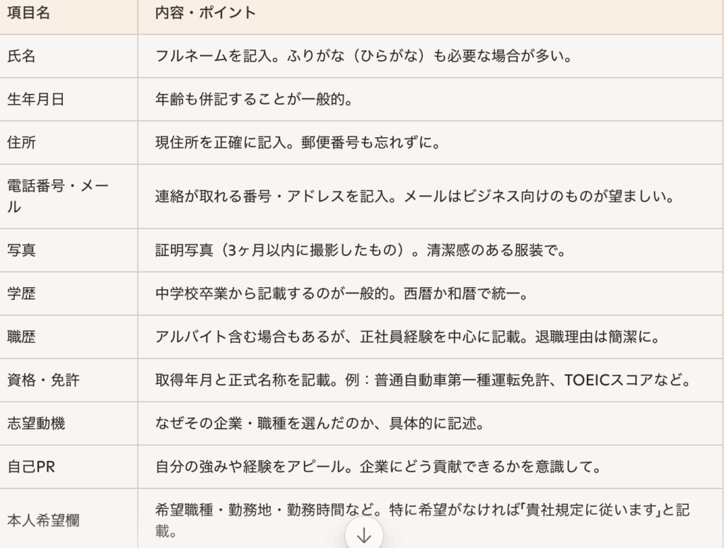 Q.copilotに「履歴書作成で必要な項目を教えてください」と聞きました